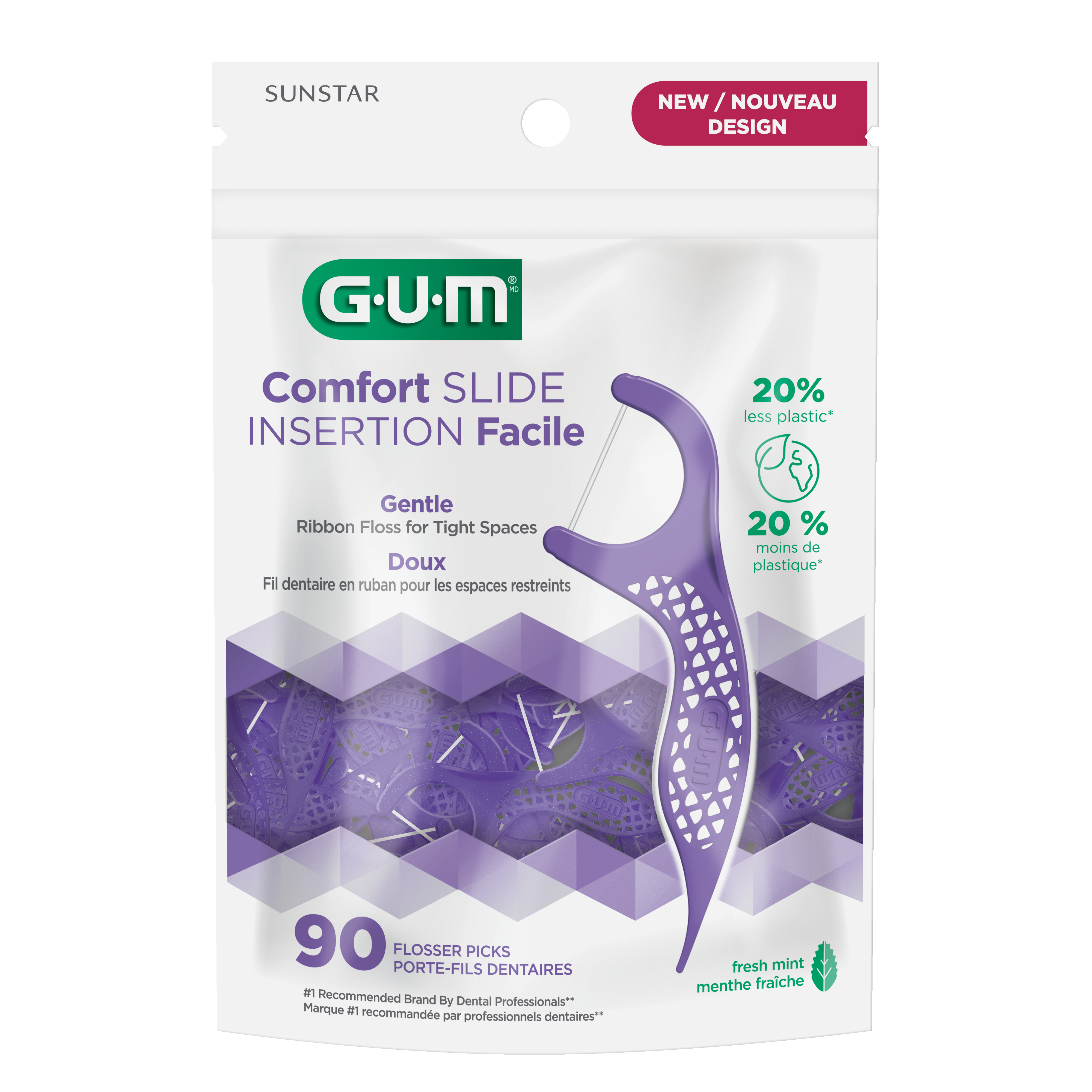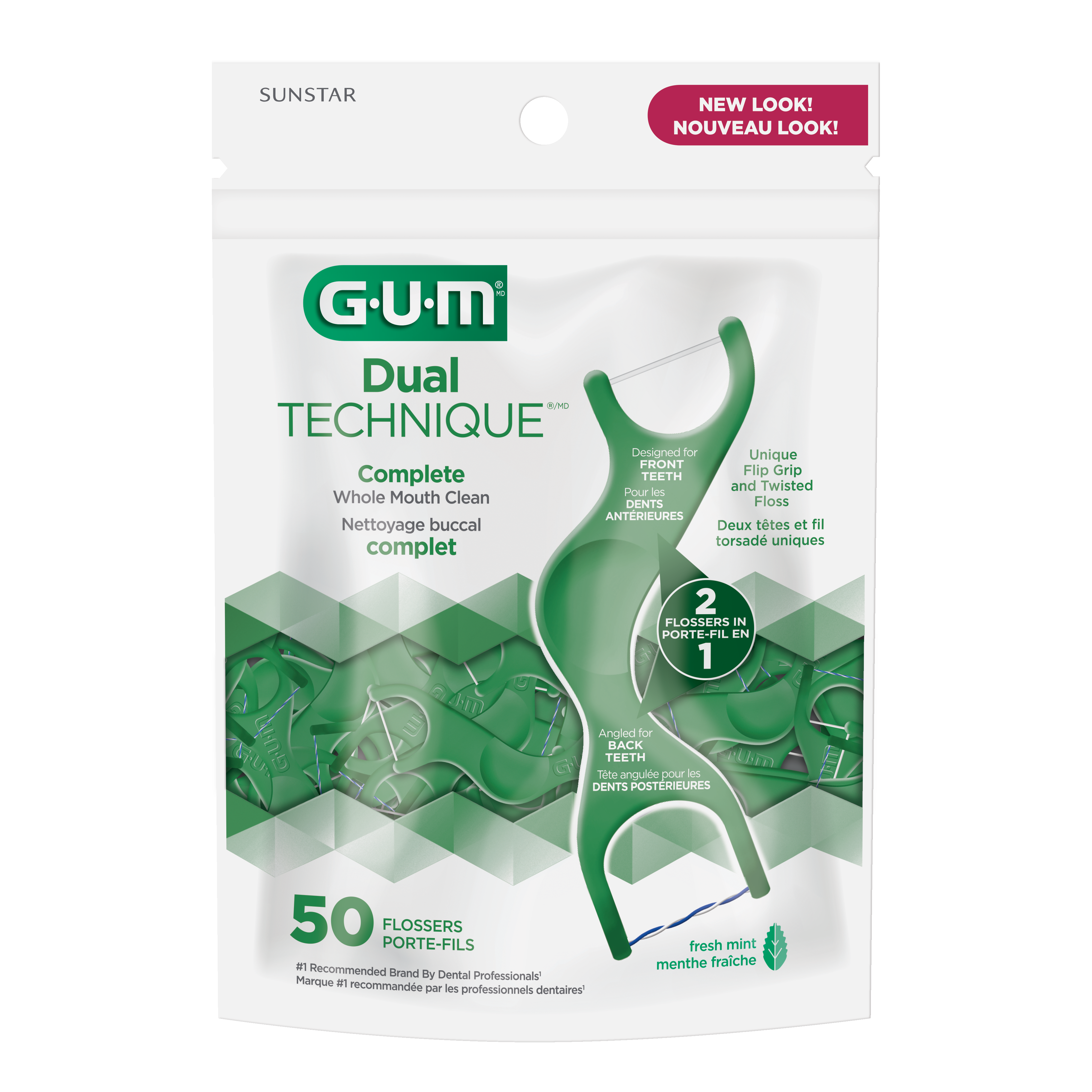 Le porte-fil dentaire Twisted MintMC de GUMMD est efficace. Son fil dentaire torsadé en instance de brevet est composé de deux fils entrelacés qui couvrent 30 % plus de surface1, ce qui aide à éliminer jusqu’à 2 fois plus de plaque dentaire2 que le fil dentaire ordinaire. La prise légère et souple est confortable dans votre main, elle est composée avec 20 % moins de plastique3. De plus, la pointe robuste aide à éliminer les morceaux de nourriture tenaces qui restent entre vos dents et son goût de menthe intense laisse votre bouche fraîche et propre. Simple, efficace et rafraîchissant, ce porte-fil dentaire fait tout.