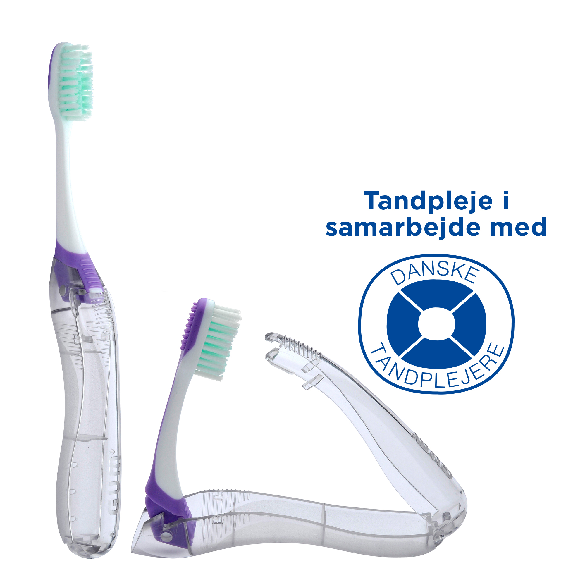 - Brug gerne tandbørstehætte med ventilationshuller eller en specialdesignet sammenklappelig tandbørste til rejser. På den måde beskytter du børsten mod bakterier og snavs, samtidig med at den kan tørre effektivt.