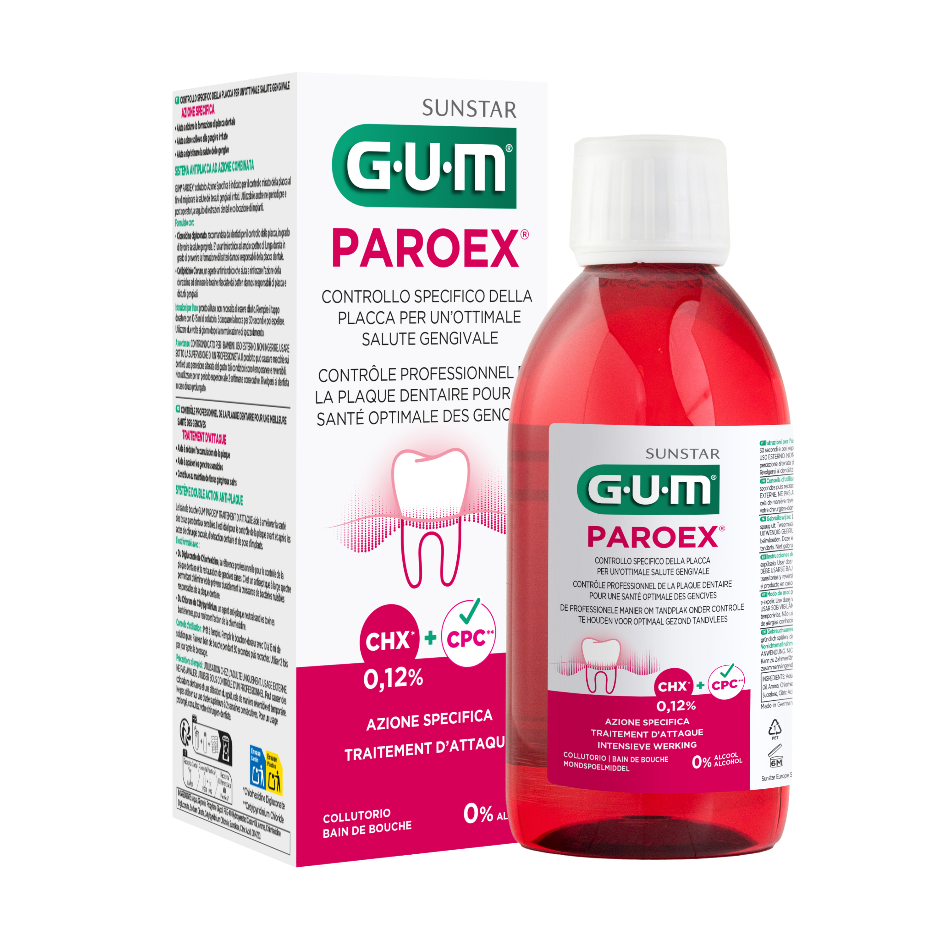 GUM PAROEX to płyn do płukania jamy ustnej z chlorheksydyną (0,12%) bez alkoholu. Dodatkowo zawiera CPC (Chlorek cetylopirydyny – 0,05%), który wzmacnia działanie antybakteryjne chlorheksydyny i niweluje toksyny powstające w jamie ustnej. Dzięki temu, że nie zawiera alkoholu, płyn jest przyjemny w smaku i nie powoduje pieczenia ani palenia w jamie ustnej.