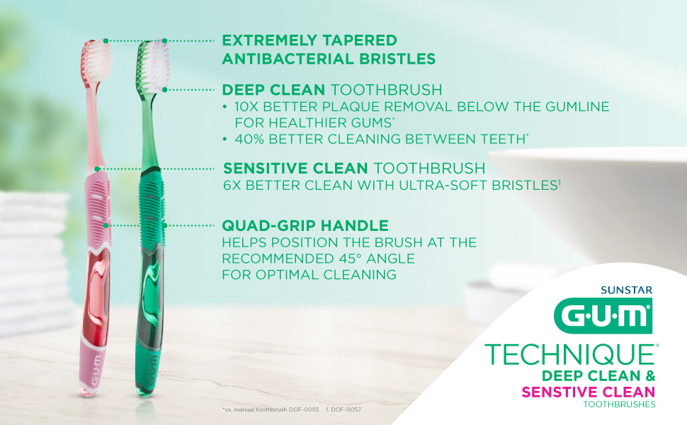 GUM® Technique® Deep Clean has soft, ultra fine tapered bristles that provide a deeper, more effective clean. The unique bristles reach over 400% deeper into hard-to-access areas below the gumline and between the teeth than the normal, flat trim toothbrushes*.
